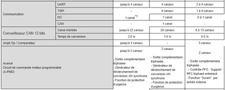En outre, la série TMPM37x ne nécessite qu’une seule alimentation 5V, avec conversion embarquée vers 3.3V et 1.5V. Sont également inclus jusqu’à deux CAN 12 bits embarqués et plus d’une douzaine de canaux d’entrée analogiques. Ces CAN disposent d’un mode conversion en continu, et assurent la conversion en 2 µs avec une horloge de conversion à 40 MHz. Certains modèles intègrent un amplificateur opérationnel 4 canaux pour la détection de courant simple ou triple à résistance shunt, ainsi qu’un comparateur pour la détection de surintensité. L’interfaçage externe est très complet avec jusqu’à 74 pins E/S.