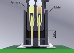 De plus, cette plage élargie inter-carte est rendue possible par une sécurité d’accouplement de contact assez grande. La connexion entre n’importe quelle variante de connecteurs ONE27® reste fiable jusqu’à une distance de 1.5 mm par rapport à la butée d’accouplement totale. Dans ce cas, la sécurité de contact entre la broche mâle et le contact double lyre femelle est assurée par une sécurité de contact à l’extraction restant de 0.9 mm.