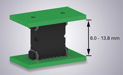 Cette distance entre carte maximum de 13.8 mm est rendue possible en utilisant des connecteurs mâles et femelles de profil médian. La distance minimum de 8.0 mm est obtenue quant à elle avec un couple de connecteurs ONE27® bas profils.