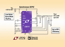 Analog Devices, Inc., qui a acquis récemment Linear Technology Corporation, annonce le LT8711, un contrôleur PWM, à mode courant et multiples topologies, qui peut être configuré facilement en convertisseur DC/DC, synchrone, abaisseur, élévateur, SEPIC et ZETA, ou en convertisseur asynchrone abaisseur-élévateur. Ce composant remplace la diode de sortie par un MOSFET canal P, de haut rendement, pour accroître le rendement et l’intensité maximale du courant de sortie jusqu’à 10A, rendant le LT8711 très compatible avec une gamme étendue d’applications de l’automobile, industrielles, solaires et d’usage général.
