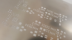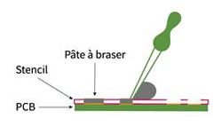 La sérigraphie : Comme pour l’impression, la sérigraphie fonctionne avec un pochoir appelé un stencil. Le stencil est une feuille d’inox où l’emplacement des pads est découpé. Vient ensuite se déposée de la pâte à braser qui est raclée sur le stencil, lui-même posé sur le PCB. Cette technique est appréciable pour la production en grande série de carte électronique. L’avantage c’est qu’une fois le stencil mis en place, le dépôt de pâte à braser est rapide (un coup de racle de 3 secondes peut couvrir un PCB de 500x500mm). Les inconvénients sont que la fabrication du stencil représente un coût important car il nécessite un laser de grande précision, le nettoyage demande l’utilisation de solvants polluants, enfin cette technique n’est pas adaptée à tous les types d’assemblage comme le THR, POP, « Pin In Paste ».