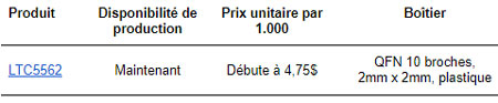 Le LTC5562 est présenté dans un petit boîtier plastique QFN de 10 broches, 2mm x 2mm. Le composant est conçu pour fonctionner avec une température de boîtier de –40°C à 105°C. Une broche de validation permet à un contrôleur externe d’arrêter le mélangeur afin d’économiser plus de puissance. Lorsqu’il est désactivé, le composant consomme un courant typique de seulement 10µA. Échantillons et quantités de production sont disponibles immédiatement.