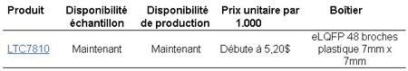 Le LTC7810 fonctionne à une fréquence fixe, pouvant être choisie entre 50kHz et 750kHz, et il peut être synchronisé à une horloge externe de 75kHz à 720kHz. L’utilisateur peut choisir le mode de fonctionnement, en continu forcé, en pulse-skipping ou en Burst Mode® à faible niveau d’ondulation, aux faibles charges. Son architecture en mode courant procure une compensation de boucle facilitée, une réponse rapide aux signaux transitoires et une régulation de ligne excellente. Le courant de sortie est détecté en mesurant la chute de tension aux bornes de l’inductance (DCR) de sortie, pour une efficacité optimale, ou en utilisant une résistance de mesure de courant en option. La durée de conduction minimale de 90ns permet des rapports de conversion élevés en mode abaisseur, à une fréquence de commutation élevée. La limitation du courant par repliement limite la dissipation thermique du MOSFET en cas de surcharge. Les caractéristiques supplémentaires comprennent un seuil d’arrêt en cas de surtension en entrée et un démarrage progressif. Le LTC7810 est disponible en un boîtier eLQFP de 48 broches, 7mm x 7mm, à performances thermiques renforcées et à espacement de broches pour les tensions élevées. Deux classes de températures de jonction sont disponibles : les versions de classes industrielles et de plage de températures élargie, de -40°C à 125°C, et la classe hautes températures de l’automobile de -40°C à 150°C.
