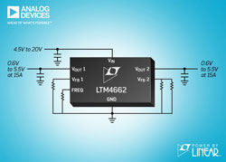 Le LTM4662 fonctionne sur une plage de la tension d’entrée de 4,5V à 20V. Avec une tension de polarisation externe de 5V, le composant peut fonctionner à partir de 2,375V. Les tensions de sortie sont réglables de 0,6V à 5,5V, ce qui permet au composant de générer non seulement une tension basse pour les composants numériques, mais aussi 2,5V, 3,3V et 5V qui sont généralement requises par les tensions des bus d’un système. La précision totale de la tension continue de sortie est garantie à ±1,5% sur la tension de ligne, la charge et la température (–40°C à 125°C). Deux LTM4662 peuvent partager le courant pour fournir 60A à une charge. De plus, les amplificateurs de mesure déportée de la carte sur les deux sorties compensent les chutes de tension causées par l’impédance des pistes de la carte PC en raison de courants élevés. Le LTM4662 offre la possibilité de choisir une boucle de régulation de compensation interne ou externe, permettant aux utilisateurs d’optimiser la stabilité de la boucle et les performances relatives aux signaux transitoires tout en minimisant le nombre de condensateurs en sortie