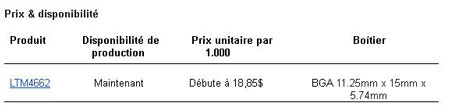 Analog Devices annonce le Power by Linear™ LTM4662, un régulateur µModule® abaisseur, double 15A ou simple 30A, dans un boîtier BGA package avec inductance superposée au boîtier pour améliorer les performances de dissipation thermiques. Les autres composants, les MOSFET, les contrôleurs DC/DC et composants d’appoint sont surmoulés et le composant complet est encapsulé dans un boîtier BGA de 11,25mm x 15mm x 5,74mm. Avec un courant d’air limité, le LTM4662 est facilement refroidi parce que l’inductance transfère la chaleur en provenance de l’étage de puissance vers l’air ambiant. Le LTM4662 peut atteindre un pic de rendement de 96%, lui permettant de générer un courant continu de 30A, pour une conversion de 12V en entrée à 1.0V en sortie, à la température ambiante de 70°C, avec un flux d’air de 200LFM. Avec la conception en double régulateur, un boîtier de petite taille et une tension précise, le LTM4662 satisfait aux contraintes quant aux surfaces des cartes PCB densément peuplées d’un système pour alimenter les composants de tension basse et de forte intensité comme les FPGA, ASIC, microprocesseurs et GPU. Les applications comprennent les cartes PCIe, les infrastructures de communications, les systèmes informatiques connectés au Cloud, médicaux, industriels, et les équipements de test & de mesure.