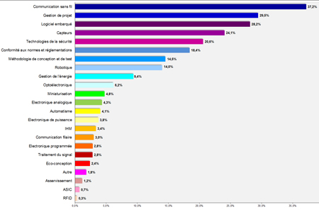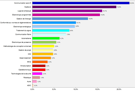 De la même façon, on retrouve, en-tête des problématiques traitées par les interventions d’experts, les technologies liées aux systèmes et objets connectés : la communication sans fil (22%), les capteurs (19%), le logiciel embarqué (16%), la programmation de microcontrôleurs (16%) et la gestion de l’énergie (13%).