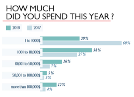 Le rapport montre que l’impression 3D est une technique de fabrication fiable, de plus en plus utilisée chaque année. 70% des professionnels augmentent leurs dépenses en impression 3D en 2018, contre 49% l’année précédente, 38% des répondants dépensent entre 1001 et 10 000 $ en technologie en 2018 (une augmentation de 11% par rapport à 2017).