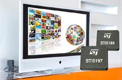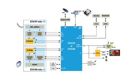 En assurant la démodulation par câble ou satellite parallèlement aux fonctions de décodage et de traitement, les circuits STi5197 et STi5189 assurent un plus haut niveau d’intégration, et avec des interfaces USB et Ethernet, ils supportent des fonctions à valeur ajoutée.