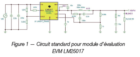 Outre le LM25017/LM5017, d’autres CI adaptés existent : TPS54308 (28 V/3 A), TPS561208 (17 V/1 A), LM53602 (36 V/2 A, FMLI élevée), LM53600/1-Q1 (36V/0,65 A/1 A), TPS562219A (17 V/2 A), LM5161 (100 V/1 A, FMLI élevée), TPS562208/09 (17 V/2 A), LM5160 (65 V/2 A, FMLI élevée), TPS54239 (23 V/2 A), LM25018/19 (48 V/0,3 A/0,1 A), LM5018/19 (100 V/0,3 A/0,1 A), TPS54120 (17 V/1 A, + LDO), TPS54227/9 (18 V/2 A).