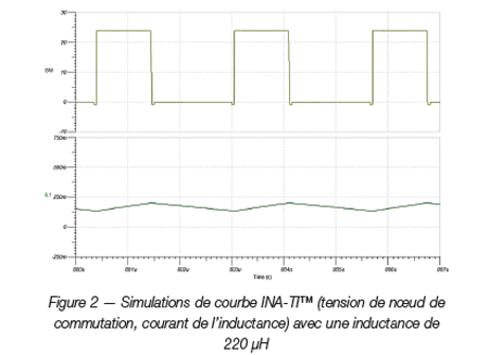 La figure 1 présente le module d’évaluation standard (EVM) pour un convertisseur Buck synchrone LM25017 (version basse tension 48 V du modèle LM5017 100 V) : la tension d’entrée est de 24 V, la tension de sortie de 10 V. Sont utilisées une inductance standard d’EVM de 220 μH et une fréquence de commutation de 480 kHz. Le courant est de 180 mA. Les courbes de commutation représentées dans la figure 2 sont générées à l’aide de l’outil logiciel de simulation TINA-TI™. Le courant d’ondulation de l’inductance est de 60 mA crête à crête et le courant de l’inductance est toujours positif.
