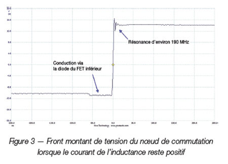 Dans l’essai réel de l’EVM (figure 3), on constate une résonance sur le front montant de tension du noeud de commutation, à environ 190 MHz. La courbe présente la forme caractéristique des commutations dures (la largeur de bande de l’oscilloscope disponible n’est que de 200 MHz, donc on peut supposer que l’amplitude de la résonance est d’environ 3 dB de plus qu’en réalité, soit environ 1,4 fois plus grande). Avant le front de montée, on observe un laps de temps d’environ 60 ns pendant lesquelles la tension est négative, ce qui correspond au moment où la diode du transistor FET inférieur assure la conduction pendant la coupure du convertisseur (cette coupure permet d’assurer un temps de latence entre les coupures des transistors supérieur et inférieur afin de prévenir tout risque de transconductance en évitant que leurs périodes de conduction ne se chevauchent). L’amplitude du dépassement et de la résonance de la courbe de tension du noeud de commutation est souvent plus élevée en montée qu’en descente.