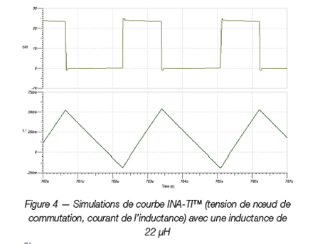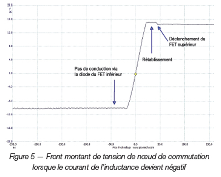 Présentée en figure 4, la nouvelle simulation de courbe affiche un passage négatif du courant d’inductance. Le courant passe en effet à zéro puis continue à chuter, comme le permettent les hacheurs série synchrones disposant d’un mode MLI forcé. En essai réel (figure 5 présentant la tension du noeud de commutation), on constate que le laps de temps sans conduction de la diode du transistor FET inférieur a disparu et que le front de montée de la courbe est plus lent et sans résonance. En voici la raison.