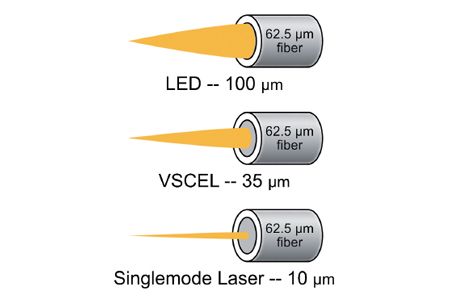 Lorsque la fibre optique a été introduite pour la première fois au profit de l’Ethernet 10 et 100 Mb/s, les sources de lumière LED étaient utilisées avec la fibre multimode de 62,5 μm, également appelée OM1. Avec une taille d’environ 100 μm, une source de lumière LED pouvait remplir l’âme de 62,5μm de la fibre OM1 et les deux ont bien fonctionné ensemble pendant plusieurs années dans des applications de 10 et de 100 Mb/s. Mais avec la nécessité de débits plus importants, les LED ne pouvaient plus être à la hauteur : leur débit maximal d’environ 622 Mb/s signifiait qu’elles ne pouvaient plus prendre en charge une transmission de 1 Gb/s ou plus.
