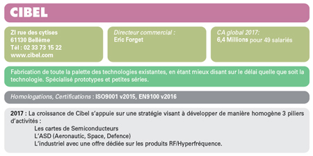 Dans chacun de ces secteurs, notre roadmap innovation apporte des solutions en matière de miniaturisation, dissipation thermique, croissance cuivre, finition, CEM. Croissance de 17%, embauche de 7 personnes supplémentaires dont un manager technique et innovation. Réaménagement de tous les locaux existants après le doublement de la surface de production. Des investissements portés sur le test final (A7) le traitement des produits spécifiques (plasma) et la première implantation en France d’une nouvelle génération de CAM. 2018 : Ligne de NiAuBonding d’ores et déjà qualifiée et opérationnelle. Nouvelle ligne de métallisation automatisée. Différents investissements mécaniques aussi bien en perçage qu’en détourage. Appareillage laser sur contrôle final. Au global, Cibel prévoit un CA 2018 en ligne avec 2017, toujours dans la gestion de sa croissance, avec la volonté d’améliorer encore son OTD et OQD. CIBEL participera à Electronica 2018.