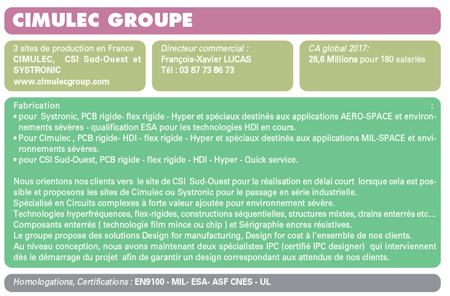 2017 : L’année 2017 a été une année dynamique pour les 3 sociétés de Cimulec Groupe avec une progression du CA de plus de 10% pour le groupe. Les démarches grand export INDE initiées depuis plusieurs années nous ont permis de développer des partenariats PCB avec les principaux acteurs MIL-SPACE pour des applications "Designed in India". Cimulec groupe n’est pas concerné sur ces projets par le "Make in India" imposé par le gouvernement indien. D’autres marchés export se sont également ouverts au Brésil, Singapour et Israël. Cimulec groupe livre dorénavant les PCB issus des 3 sites de production en Europe, Israël, Turquie, Singapour, Thaïland, Brésil, Canada, Inde, Corée du Sud, Japon etc…