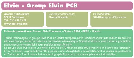 2017 : Renforcement des synergies entre les sites pour les applications AeroMil et spatiales. Bunisess unit dédiée. Renforcement de la R&D en particulier pour des applications Cu épais, fortes épaisseur et gravure fine (HDI). Croissance à l’export et création de la structure EPI (Elvia Print International) qui commercialise des PCB produits en Asie.