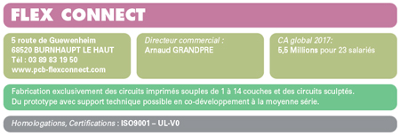 2018 : L’objectif du CA est d’atteindre les 6M€. Un grand effort de plusieurs millions d’euros est prévu au niveau des investissements ces 3 prochaines années pour répondre aux nouvelles exigences du circuit imprimé souple. Le circuit souple est employé dans de nouvelles applications avec de nouvelles contraintes. FLEX CONNECT sera présent à ENOVA Paris 2018.