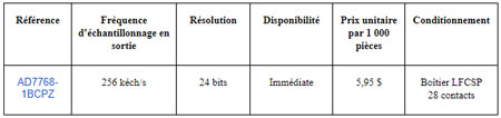 Analog Devices, annonce sous la référence AD7768-1 un convertisseur analogique/numérique sigma-delta ( ?¦¤) 24 bits monovoie, qui combine basse consommation et performances élevées pour les opérations de conversion de signaux alternatifs (AC) et continus (DC). Le convertisseur AD7768-1 permet de réaliser des solutions d’instrumentation basse consommation conçues pour surveiller l’état opérationnel des équipements de maintenance prédictive (mesure des vibrations et de la qualité de l’énergie), de tests audio et acoustiques, de santé structurelle et de tests électriques automatiques et modulaires. Ce convertisseur convient également aux appareils médicaux, tels que les électroencéphalogrammes (EEG), électromyogrammes (EMG) et électrocardiogrammes (ECG).