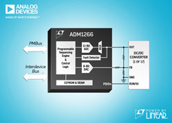 L’ADM1266 intègre un convertisseur analogique- numérique (CAN) et neuf convertisseurs numériques-analogiques (CNA) à sortie en tension, qui ajustent le nœud de la boucle de régulation ou la référence d’un convertisseur DC /DC pour implémenter un système de boucle, autonome de désignation de marges. Une EEPROM non volatile enregistre la tension, la durée et l’information de dysfonctionnement selon les indications du générateur de séquences, ce qui accélère le dépannage.