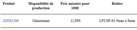 Spécifié sur la plage de températures de -40oC à 85oC, l’ADM1266 est présenté en un boîtier LFCSP de 64 broches, 9mm x 9mm. Des échantillons et cartes du circuit d’évaluation sont disponibles en ligne ou auprès de votre revendeur local Analog Devices. Pour plus d’informations, visitez le site www.analog.com/ADM1266
