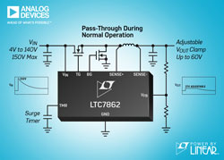 Analog Devices annonce le Power by Linear™ LTC7862, un bloqueur à découpage de signaux transitoires, de rendement élevé, avec protection contre les surtensions et les surintensités pour les systèmes à haute disponibilité. Le LTC7862 commande un étage à MOSFET canal N de puissance. En fonctionnement normal, le LTC7862 transfère la tension d’entrée vers la sortie avec un minimum de pertes de conduction. En cas de surtension en entrée, le LTC7862 commence à découper comme un régulateur DC/DC de haut rendement, pour protéger les composants sensibles, en aval, en limitant le courant et la tension de sortie.
