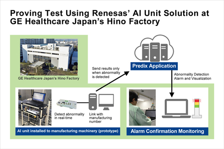 Renesas Electronics Corporation, l’un des principaux fournisseurs de solutions avancées à base de semi-conducteurs, a annoncé aujourd’hui que Renesas et l’usine Hino de GE Healthcare Japon avaient effectué ensemble des tests utilisant la "solution d’unité IA" de Renesas. La solution d’unité IA est l’une des solutions e-AI (intelligence artificielle embarquée) de Renesas pour la fabrication d’équipements permettant d’adapter l’IA aux équipements embarqués des points de terminaison. À la suite de ces tests, il a été vérifié que le rendement de production dans le processus applicable pouvait être augmenter jusqu’à 99.5% en réduisant les éléments insatisfaisants, et que cette technologie était capable d’améliorer considérablement la productivité. Bien que Renesas ait déjà effectué des tests dans ses propres usines, ce test de démonstration a démontré que la "solution d’unité IA" de Renesas est également efficace dans les usines d’autres sociétés.