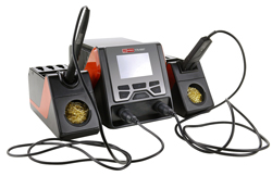 Le fer à souder fourni avec la station affiche une puissance de sortie de 130W et se distingue par la rapidité de son temps de chauffe et de récupération. La température maximale est atteinte en 10 secondes. La pince à souder de 100W possède une fonction de soudage et de dessoudage adaptée à une variété de composants montés en surface. De plus, la puissance maximale de 150 W disponible pour un fer à souder mono-canal permet de souder des pastilles de grandes dimensions et des plans de masse.