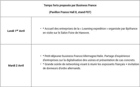 Il faut ajouter à ces entreprises exposantes une soixantaine d’entreprises emmenées sur la Foire de Hanovre par Bpifrance pour venir s’inspirer des différentes solutions proposées en matière d’industrie du Futur sur la Foire de Hanovre. Cette initiative est notamment soutenue par les groupes industriels Bosch France, Dassault Systemes et SAP France.