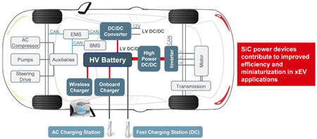 Ces dernières années, un nombre croissant de constructeurs automobiles proposent des véhicules électriques en réponse à la prise de conscience croissante pour l’environnement et à l’augmentation du prix des carburants. Toutefois, même si les VE sont de plus en plus répandus, leur autonomie relativement courte demeure problématique. Pour améliorer l’autonomie sur route, les batteries visent une plus grande capacité et des temps de charge plus courts. Ceci, à son tour, exige une puissance et une efficacité élevées sur les chargeurs embarqués comme 11 kW et 22 kW, ce qui conduit à une adoption accrue des MOSFET SiC. De plus, les batteries à haute tension (800 V) nécessitent des dispositifs d’alimentation à faible perte et à tension de tenue plus élevée.