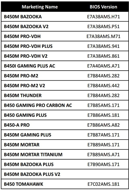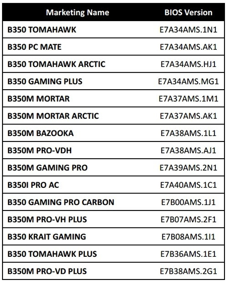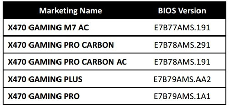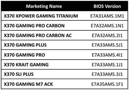Vous trouverez ci-dessous une première liste des versions de BIOS à venir, qui incluent la compatibilité des APU AMD de nouvelle génération pour nos cartes mères AM4 séries 300 et 400, basées sur la dernière version 1.0.0.0 du produit AMD Combo PI. Ces nouvelles versions du BIOS sont attendus en Mai de cette année.