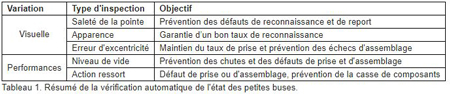 Il convient aussi de noter que la buse adaptée pour prendre des composants de 0201 mm a un calibre de 0,1 mm seulement et peut facilement se bloquer. L’inspection visuelle de si petits composants étant souvent impossible, la vérification automatique de l’état des buses intégrée aux machines de report de composants de la série YS de Yamaha inspecte visuellement la buse au moyen de cameras à vision latérale et ascendante et vérifie la performance de prise. Le Tableau 1 décrit les éléments vérifiés pour chaque buse