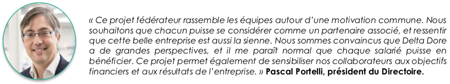 « La direction ainsi que les fondateurs proposent une belle opportunité aux collaborateurs de contribuer et d’être impliqués ’autrement’ au développement de l’entreprise. A mes yeux, ce dispositif est réellement « gagnant-gagnant » tout en laissant la possibilité à chacun de se faire son propre avis. » Vincent Battaglia, Group Purchasing Leader, mechanical parts de Delta Dore