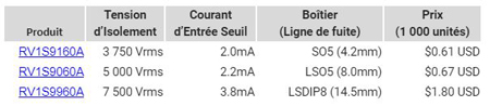 Tension d’isolement : 3 750 Vrms (RV1S9160A), 5 000 Vrms (RV1S9060A) et 7 500 Vrms (RV1S9960A)