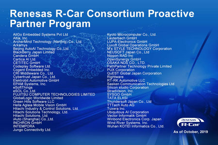 Afin de développer davantage les activités du consortium R-Car, Renesas a certifié 55 entreprises partenaires proactives afin de permettre à Renesas de collaborer de manière plus stratégique. Les 55 partenaires ont été choisis en fonction de leur capacité à fournir trois valeurs : « ouvert » (fourniture d’un environnement de développement flexible et diversifié utilisant des systèmes ouverts), « innovant » (capacité à fournir des technologies avancées et des solutions permettant de résoudre les problèmes des utilisateurs), et « digne de confiance » (la capacité de formuler des propositions de système extrêmement fiables sur la base de la solide expérience acquise dans le secteur de l’automobile). Les clients peuvent accéder au programme pour examiner et déterminer facilement les partenaires optimaux et les solutions les mieux adaptées à leurs applications, appareils, besoins ou problèmes, grâce à un système de recherche fourni par les sociétés certifiées. Cela aide nos utilisateurs dans leurs efforts pour relancer le développement de systèmes ou de PoC (Proof of Concept), accélérant ainsi la mise sur le marché de nouveaux produits.