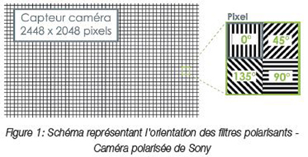 Cette caméra GigE Vision est dotée d’un capteur CMOS matriciel IMX250MZR intégrant un filtre polarisant par pixel. Les filtres sont orientés à 0°, 45°, 90° ou 135° (cf. schéma présenté ci-dessous). Le capteur recueille alors des données sur l’intensité de polarisation. Une fois exploitée, ces données permettent de déterminer le degré de polarisation et sa direction. Ces informations permettent d’obtenir des images de la scène selon un angle de polarisation précis. Au final, il est possible de créer une image applicative optimisée. On peut alors traiter cette image pour y détecter des défauts jusqu’alors difficilement décelable comme une aspérité dans un matériau transparent.