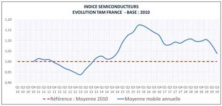Le marché mondial des semiconducteurs a connu des baisses parmi les plus fortes de son histoire au quatrième trimestre 2018 et au premier trimestre 2019. Au cours de cette période, on a pu observer que le marché français était épargné par ce retournement brutal de la conjoncture, notamment en raison de sa moindre exposition aux fluctuations du marché des mémoires (lequel est entré en récession dès le quatrième trimestre 2018). De ce fait, la sensibilité relative du marché français à l’état des stocks de composants dans la chaîne de valeur est d’autant plus importante. C’est ce qui explique pour une bonne part que le retournement à la baisse soit apparu sur le marché français avec un décalage d’environ six mois par rapport au reste du monde. Le marché mondial ayant montré des signaux positifs dès septembre 2019, les perspectives du marché français semblent nettement plus favorables pour l’année 2020.