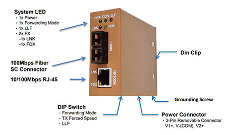 Le modèle offre une conversion de média de qualité industrielle Fast Ethernet vers Fibre optique à 1 port entre 10/100BaseT(X) et 100BaseFX (connecteurs SC / ST).