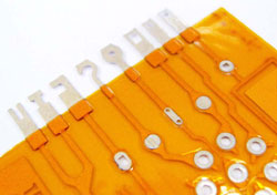 L’épaisseur initiale du cuivre utilisé sur les circuits en relief est 0,010” (254 microns). Les circuits sculptés utilisent ce matériau pour en tirer le profit maximum, car il donne des terminaisons robustes, non soutenues. Les doigts non soutenus, mis en forme d’une manière ou d’une autre, sont beaucoup plus endurants que ce que l’on obtient en utilisant les techniques conventionnelles de circuit souple qui utilisent du cuivre beaucoup plus mince, généralement 0,0027” (0,07 mm), ou même encore moins dans tout le circuit.