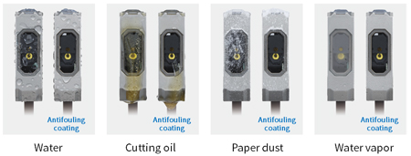 3. Premier revêtement antisalissure de l’industrie qui empêche la contamination de la surface de détection (brevet en cours*5) Le revêtement antisalissure sur la surface de détection de la série E3AS empêche les gouttes d’eau, l’huile et la poussière de se déposer sur la surface de détection et protège également la lentille de la buée, permettant de réduire les fausses détections et la fréquence de nettoyage.