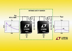 Les équipements de sécurité intrinsèque doivent fonctionner dans des environnements risqués, dans lesquels l’ensemble de la puissance dissipée doit être limitée dans les conditions de fonctionnement normal ou anormal, afin d’éviter des explosions pouvant être causées par l’inflammation de gaz dangereux. Les techniques de protection traditionnelles emploient des barrières de protection Zener à base de composants passifs volumineux, qui consistent en diodes Zener, résistances et fusibles. Ces composants doivent être proportionnés dans le rapport de 1,7 fois la puissance qu’ils dissipent, ainsi une résistance destinée à la protection d’un circuit intégré en panne peut atteindre la taille d’un pouce. Le LT4356-3 procure une barrière active qui, en fonctionnement normal, transmet l’énergie d’entrée directement à la charge, avec très peu de pertes.