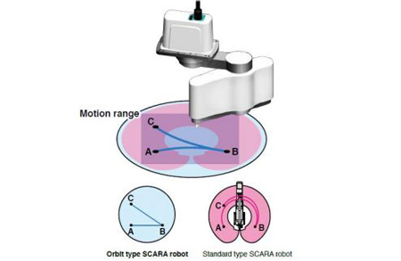En cas de manque d’espace, les robots SCARA orbitaux montés au plafond permettent d’accéder à n’importe quel emplacement dans l’enveloppe de travail ci-dessous (Schéma 2), offrant ainsi plus de liberté pour réduire l’empreinte de production.