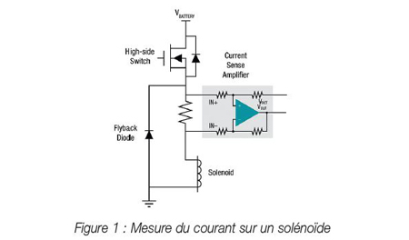 Comme l’illustre la figure 1, une résistance de mesure est placée entre le commutateur et le solénoïde. Le résistor de faible résistance ohmique est inséré de manière à créer un chemin à faible résistance, à fournir des mesures fiables et à assurer une recirculation du courant électrique. Un amplificateur en configuration différentielle ou un amplificateur de mesure du courant est relié à la résistance afin d’assurer la mesure du courant.