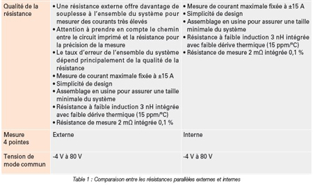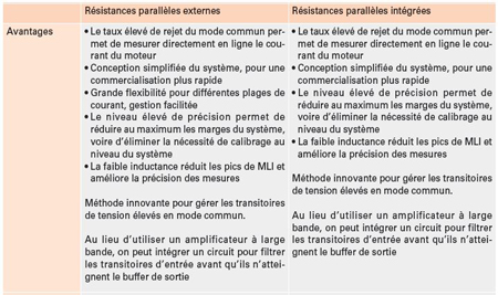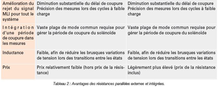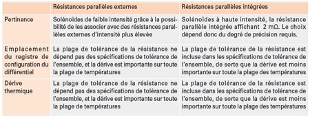 Les dispositifs de mesure du courant des solénoïdes peuvent être conçus avec des résistances parallèles externes ou intégrées, en fonction de la précision de mesure requise. Chacune de ces deux solutions présente ses propres avantages. Les tableaux 1 et 2 offrent un récapitulatif des différences et des atouts de chacune de ces deux structures.