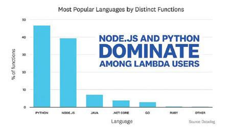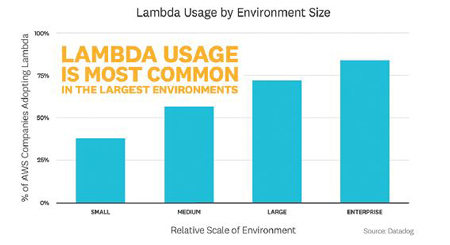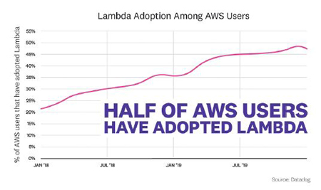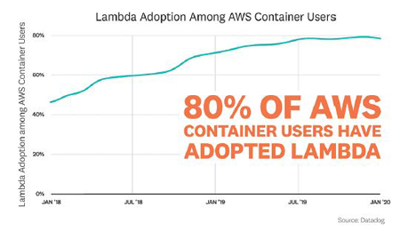 En janvier 2020, près de 80 % des organisations exécutant des conteneurs dans AWS avaient adopté Lambda. Bien que les fonctions serverless et les conteneurs soient deux environnements très différents, ils ont tendance à être adoptés pour des raisons similaires, telles que ne pas devoir se soucier de la gestion d’infrastructure pour le bon déroulement des opérations. Dans certains cas d’utilisation, les infrastructures Lambda et les conteneurs sont directement connectés (par exemple, les fonctions Lambda utilisées pour déclencher les tâches du service d’Amazon Elastic Container Service), mais beaucoup d’autres organisations les utilisent séparément pour répondre à des besoins différents. Par exemple, une entreprise peut exécuter la majeure partie de son application dans un cluster de conteneurs, tout en déchargeant au serverless des tâches éclatées et de courte durée (telles que le traitement des paiements).
