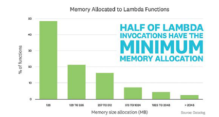 Une fonction Lambda dure en moyenne 800 millisecondes, mais la queue de la distribution de la latence est longue. Un quart des fonctions Lambda ont un temps d’exécution moyen de plus de 3 secondes, et 12 % prennent 10 secondes ou plus. L’étendue de certaines fonctions Lambda se remarque car la latence serverless a un impact non seulement sur les performances de l’application mais aussi sur les coûts du cloud. La tarification Lambda est basée sur les "Go-secondes" de temps de calcul : la mémoire allouée à la fonction multipliée par la durée de ses invocations.