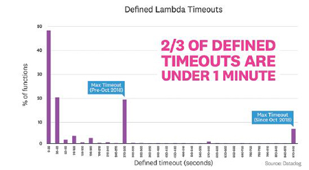 Chaque fonction Lambda a un paramètre de temps d’arrêt configurable, allant de 1 seconde à 15 minutes maximum. La plupart des fonctions utilisent des arrêts courts, les deux tiers étants des configurations de 60 secondes ou moins. Le temps d’arrêt par défaut lors de la création d’une fonction est de 3 secondes. Des délais courts sont souvent conseillés, à la fois parce que l’interruption des fonctions peut entraîner des coûts de cloud et parce que les architectures d’application Lambda nécessitent souvent une réponse rapide.