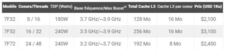 La puissance de ces nouveaux processeurs trouve son origine dans une architecture équilibrée qui réunit les cœurs « Zen 2 » à haute performance et des innovations notables. Ces dernières se retrouvent dans le design système avec le PCIe® 4 mais aussi la mémoire DDR4-3200v ainsi que l’architecture AMD Infinity. Le tout participe à proposer aux clients des performances système optimales et simplement épatantes dans les applications de tous les jours. Voici le détail des nouveaux processeurs :