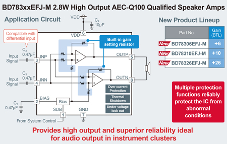 ROHM a développé la série BD783xxEFJ-M pour les tableaux de bord de véhicules, requérant différentes sorties de sons à fort volume, y compris les sons d’avertissement, les clignotants, les tonalités de bienvenue et le guidage vocal. En outre, l’adoption d’un nouveau type de circuit de protection contre les surtensions (OCP) offre une protection contre les courts-circuits de sortie (dommages dus à un contact accidentel avec la borne) pour délivrer une sortie haute puissance de 2,8 W qui était difficile à atteindre dans le passé. En plus de la protection contre les surtensions, l’arrêt thermique intégré et le verrouillage en cas de sous-tension (UVLO) assurent une protection hautement fiable contre les conditions anormales.