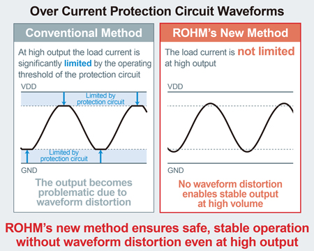 En revanche, le nouveau circuit de protection contre les surtensions de ROHM élimine la nécessité de limiter la production en empêchant la distorsion de la forme d’onde, même à haute puissance. Cela permet à la série BD783xxEFJ-M de fournir une protection contre les surtensions issues de courts-circuits de sortie qui était par le passé difficile à réaliser avec une haute puissance (2,8 W max. avec une charge de 4 ¦¸ et 10 % de distorsion).