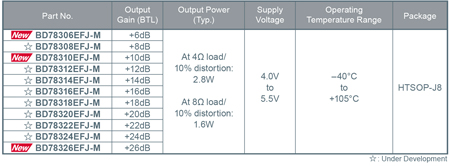 ROHM propose des produits présentant des gains de sortie de +6 dB (BD78306EFJ-M), +10 dB (BD78310EFJ-M), et +26 dB (BD78626EFJ-M). La gamme sera étendue pour inclure un total de 11 modèles s’échelonnant de +6 dB à +26 dB par paliers de 2 dB.